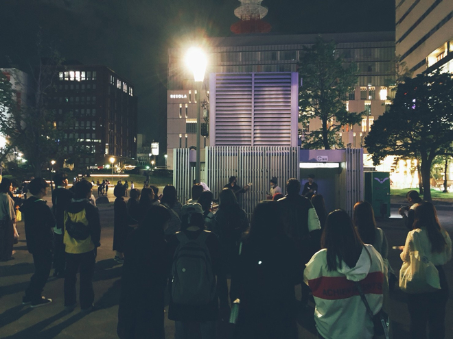 ▲ライブ後、大分駅前の地図を見つけて座り込むRe:ply