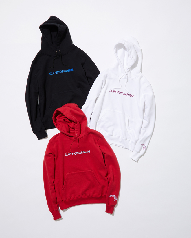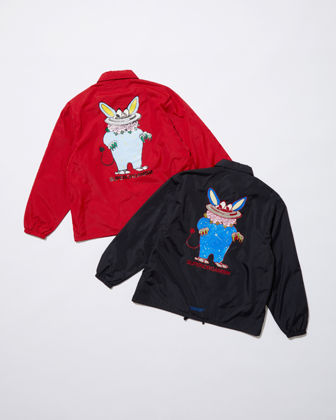 スーパーオーガニズムとUNDERCOVERとは、19S/Sメンズコレクションのランウェイでの楽曲使用や雑誌『SWITCH』でのファッションシューティングなどを通して、関係を築いてきた。今回のコラボレーションアイテムは、Tシャツ、ロンT、パーカ、コーチジャケット、ショルダーバッグの全5型が揃う。スーパーオーガニズムが発信するピースフルなイメージを元に、宇宙や花といったポップなモチーフを組み合わせて特別にデザインしたオリジナルモンスターがプリントされている。