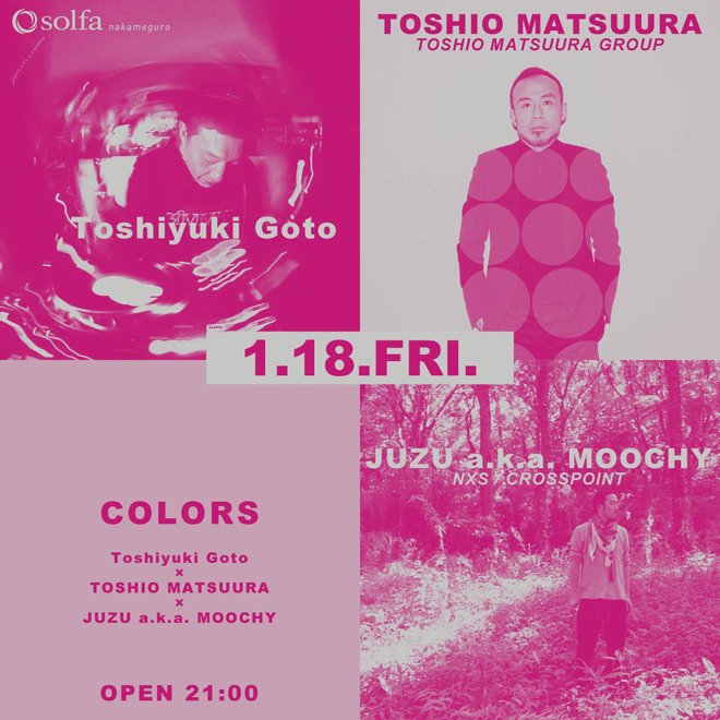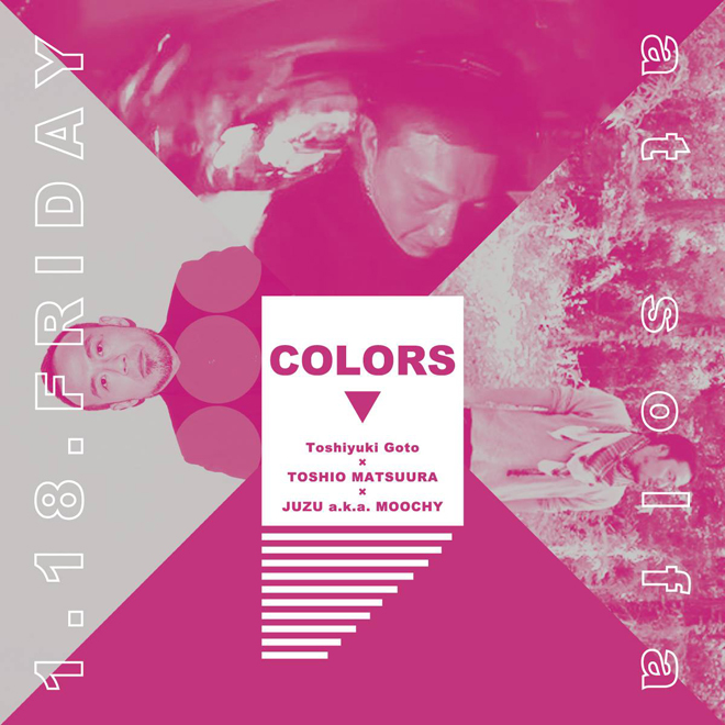 Toshiyuki Goto、TOSHIO MATSUURA、JUZU a.k.a. MOOCHYの三者によるパーティ<Colors>が1月18日(金)に中目黒solfaにて開催される。