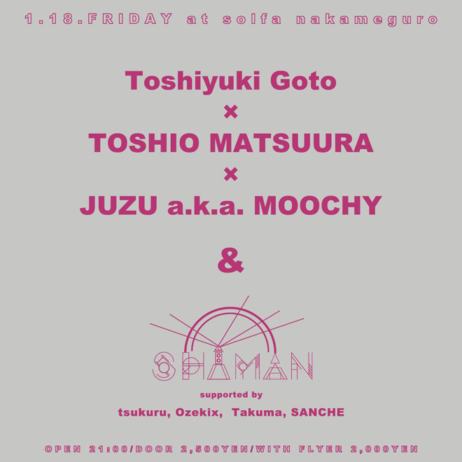 Toshiyuki Goto、TOSHIO MATSUURA、JUZU a.k.a. MOOCHYの三者によるパーティが中目黒solfaにて開催