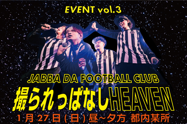 また、JABBA DA FOOTBALL CLUBは“EVENT”という月イチレギュラーイベントを行っており、1月のEVENTは<撮られっぱなしHEAVEN>と題して、ファンによるJABBAのパフォーマンス撮影会を実施。カメラマンになれるのは抽選で選ばれた10名のみで、既に応募期間は終了している。ファンが撮影した映像はNEW EP収録の新曲MVに使われるとのことだ。