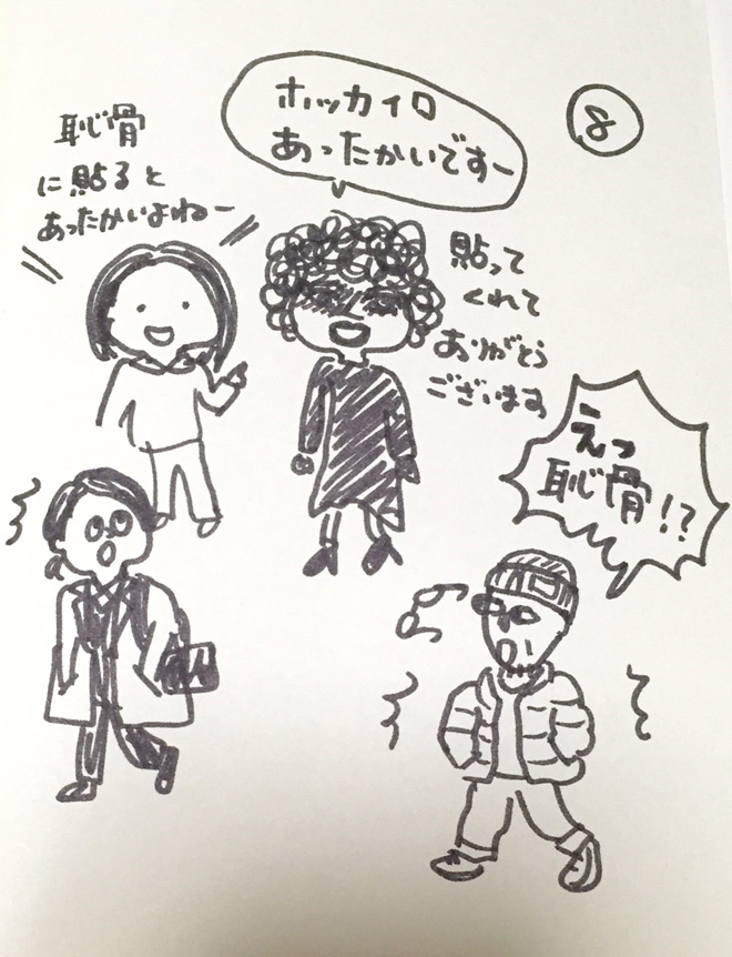 「恥骨に貼ると暖かいよねー!」と衣装さんが言い、信藤さんの目が飛び出る