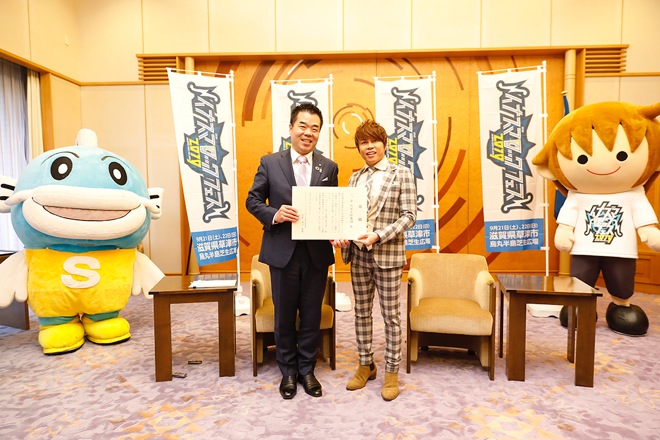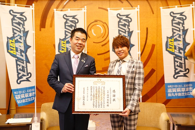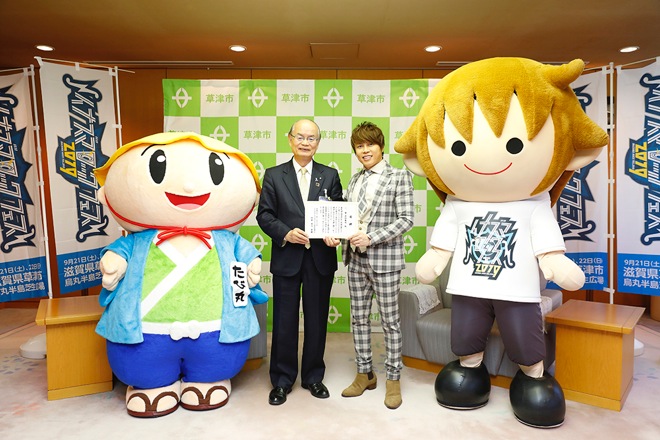 同日、草津市役所で行われた橋川渉・草津市長への表敬訪問では、市長が草津市の活性化と琵琶湖の環境保全のための貢献に対する感謝状と、草津名物のひょうたんを贈呈。西川は「10年続けられたのは地域のみなさんのご協力、市長をはじめ行政のみなさんのお力添えのおかげです。2019年度も開催させていただき、ますますイベントを大きくできるよう頑張ります」と語った。