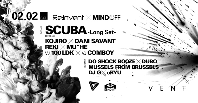今回の<Re:Invent x MIND OFF>によるスペシャルパーティには、<Re:Invent>レジデントのKOJIROとダニ・サヴァント、同じく人気のパーティ<Elephant>からREKIとMU”HEがB2Bで参戦。世界の流行とは真逆のことを行い、常にオーディエンスを驚かせる作品をリリースすることでSCUBAはテクノの異端者とも評されてきたが、その研ぎ澄まされた作品とDJプレイは日本でも非常に人気が高く、約2年ぶりとなる来日公演で披露するロングセットは見逃し厳禁だ。