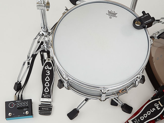 セッティングは非常にカンタン。アコースティック・ドラムに別売りのドラム・トリアーを取り付けて、ケーブルで「TM-1」と接続するだけ。本体のスイッチで好みの音色を選択、音色の調整もつまみの操作だけで行える。
