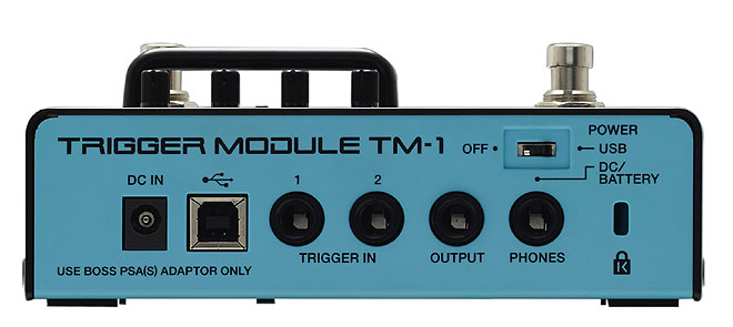▲リアパネルには2系統のTRIGGER IN、OUTPUTとPHONES端子(どちらもステレオ標準タイプ)、USB端子、DC IN端子を配置。OUTPUT端子からの出力はTRIGGER 1と2をミックスした音をモノで出力するか、各トリガーを左右に分けて出力するかを選択可能。電源は乾電池(9V形)、ACアダプター(別売り)、USB給電に対応。