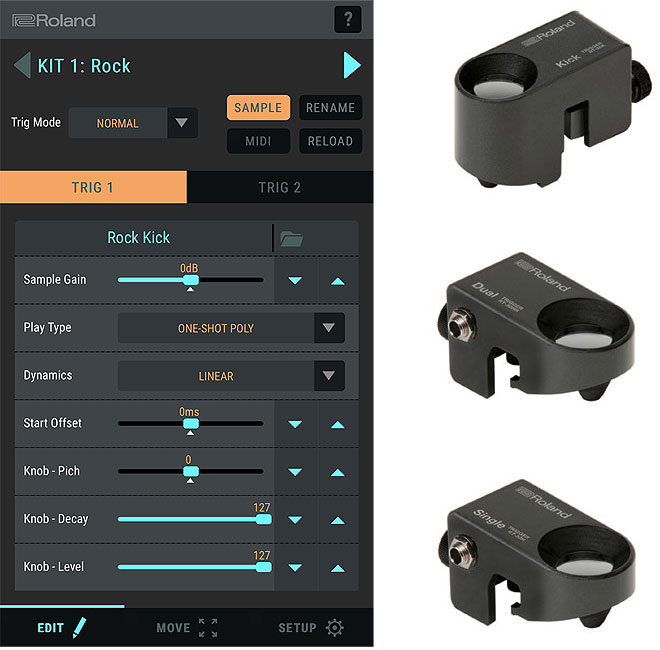 ▲専用エディター・アプリ(左)でカンタンに音色を差し替え調整ができる。右の写真は、「TM-1」と組み合わせて使う別売りドラム・トリガー。上からバスドラム用「RT-30K」、スネア用「RT-30HR」、タム用「RT-30H」。