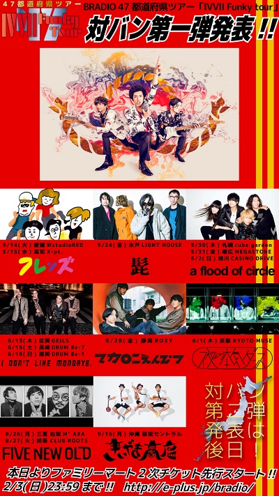 BRADIOが5月から開催する<47都道府県ツアー “IVVII Funky Tour”>の対バンアーティスト第1弾が発表された。