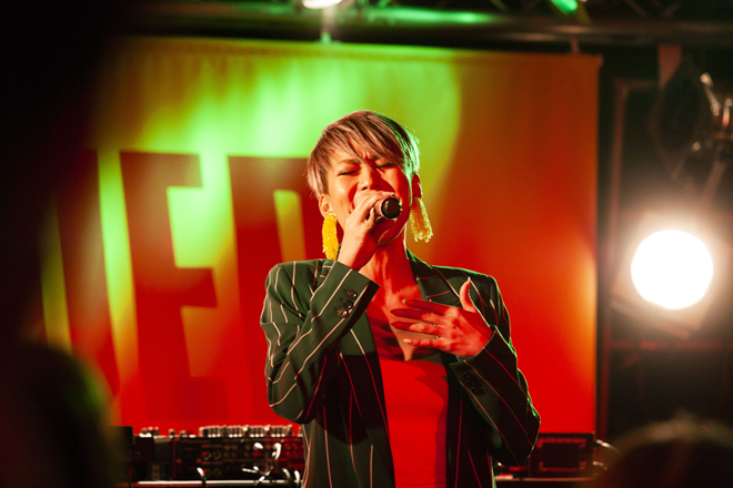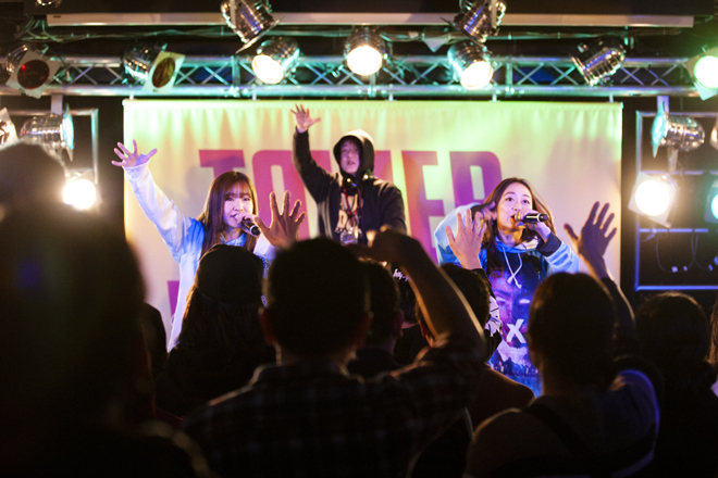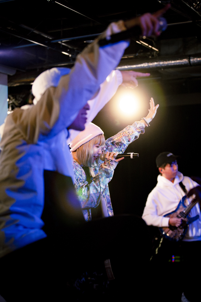 その後、B1F「CUTUP STUDIO」にて二部制のライブが開催。RHYMESTERの門下生として知られる女性ラップデュオ・hy4_4yhが一部のトップバッターとして登場。切ないラブソング「せいいっぱいの恋」や、RHYMESTERへのリスペクトが溢れる「人間交差点 午前10時40分」などを披露した。続いて、トークショーにも参加したHeartbeatが、パワフルなヴォーカルで代表曲「Fire」のリミックスバージョンを歌い上げ、MCで1stフルアルバム『Here I am』のリリースを発表した後、表題曲を熱唱した。トリを務めたのは、個性派ラッパー・SHO。ブランド名をひたすら連呼するサビが耳に残る「LOUIS VUITTON」、新曲「たまにFENDI」を披露。「今年こそ流行語大賞を狙ってるんでよろしく」と言い放ち、代表曲「薬物はやめろ」のコール&レスポンスを要求し、エモーショナルに会場を煽った。
