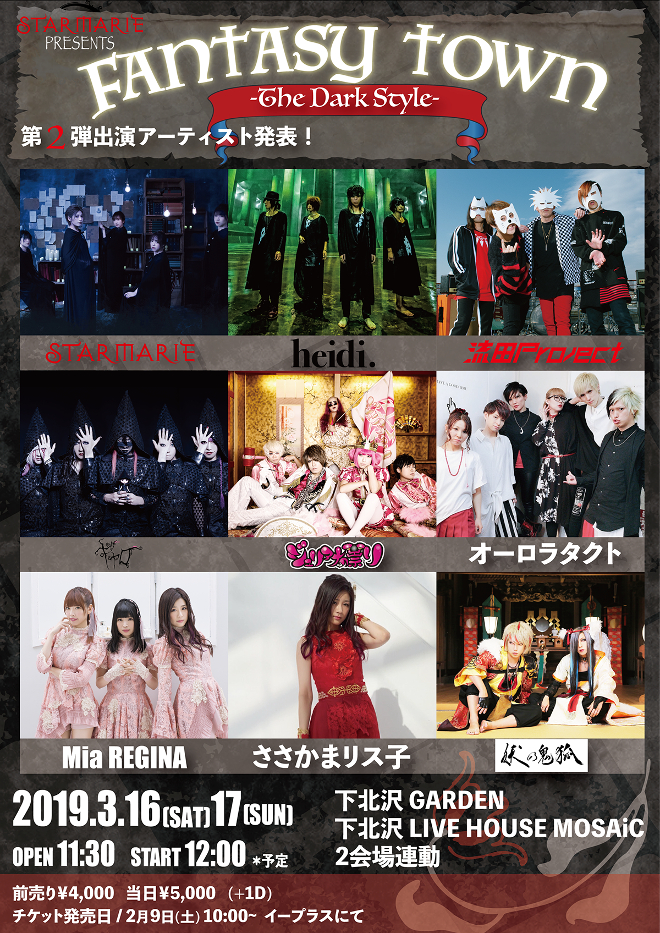 STARMARIEが、3月16日-17日に下北沢にて主催する自身のコンセプトである“ファンタジー”をテーマにしたサーキットイベント<FANTASY TOWN -The Dark Style->の第2弾出演者が発表となった。