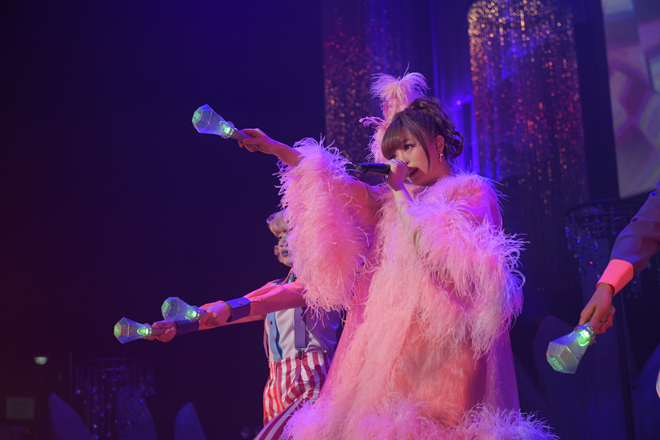 このイベントは、通常のライブとは異なったスペシャルな内容で、ライブパートとトークパートの二部構成。ライブパートは、「にんじゃりばんばん」からスタート。ピンクのフェザーやキラキラのラメが印象的な衣装に身を包んだきゃりーはさながらプリンセスのよう。続く「音ノ国」ではきゃりーの声に合わせてオーディエンスもペンライトの色を変え、全員が一体となってイベントを盛り上げる。MCでは「20歳の時からバースデーイベントは深夜のクラブでやっていたのですが、夜中の3時にライブをし続けるのも大変だし(笑)、今年は夕方からのイベントにしてみました。25歳最後のライブを楽しんでください」と今日のイベントが初めての試みであることを語り、そのまま「6年前のあの歌を聴いてください」という言葉と共に始まったのが「ふりそでーしょん」。各々が6年前に思いを馳せつつ、「きみのみかた」「ちゃみちゃみちゃーみん」とライブは進む。「恋ノ花」をしっとり歌い上げる姿からは、すっかり大人のレディらしさも感じさせる。