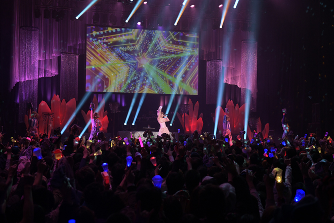 後半戦は「きらきらキラー」「PON PON PON」「ファッションモンスター」と、きゃりーのこれまでを象徴するようなポップでアッパーなナンバーが続き、フロアの盛り上がりは最高潮に。「ゆめのはじまりんりん」を歌い終え、いよいよラストナンバーの「原宿いやほい」へ、と思ったら、突然会場にはハッピーバースデーの音楽が流れ、そのまま大合唱! スクリーンにはピアノを弾く中田ヤスタカの映像が流れるというサプライズが。ダンサーから大きな花束と、ファンが協力して作ったメッセージボードが贈られた。心底びっくりした様子のきゃりーだが、無事にラストナンバーをパフォーマンスし、きゃりーぱみゅぱみゅ25歳ラストのライブを終えた。