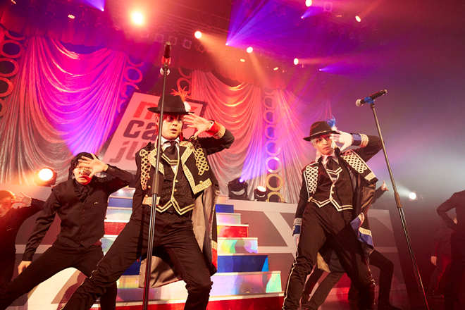A-KIRAによる「me can juke 2nd concertは、このデジタル世界の中、アナログでどうにかしてミュージックビデオみたいなことを生でお届けできないかなと思って始まったんです」という説明もあったが、1曲1曲のパフォーマンス、ひとつひとつのコーナー、そのすべてが昭和のテレビ番組にも劣らない工夫とユーモア、お客さんを喜ばそうとするサービス精神に溢れていた。それは同公演に向けて制作されたと思われる新曲もそうで、例えば「16号線のジュリエット」なるナンバーは、イントロのオルゴール音や名調子からして古き良き昭和感が溢れており、チェック地の衣装姿で「抱きしめてよ ねぇジュリエット もう一度だけ〜♪」と歌い上げる姿には、あの時代を少年少女として生きていた者であればノスタルジックなトキメキを感じずにはいられない。そうした温もりあるエンターテインメントを随所に散りばめる徹底ぶりは、彼らの最大の魅力と言える。