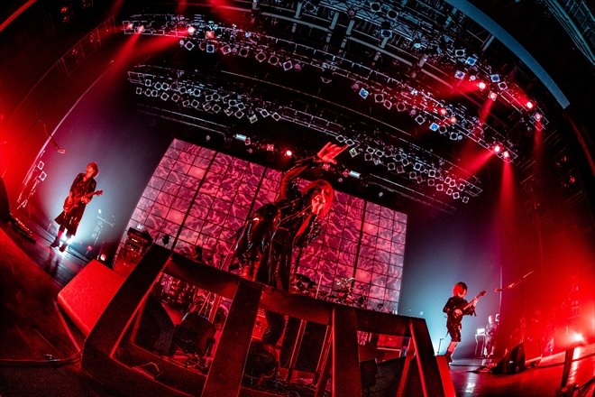 その後、「いけるか東京! いけんのか、かかってこい!」というマモ(Vo)の新年一発目の煽りから、「喪失-soushitsu-」へと場面が切り替わると、フロアも戦闘モードに。続く「アポカリプティックサウンド」では天井高くまで吹き出したCO2の柱に突進するかのごとく、Z(G)、楓(G)、七星(B)がステージ前方ギリギリまで出てきて演奏していく。そこからはいつものスタイルと同じように、SEを挟みながら本編は進行していった。