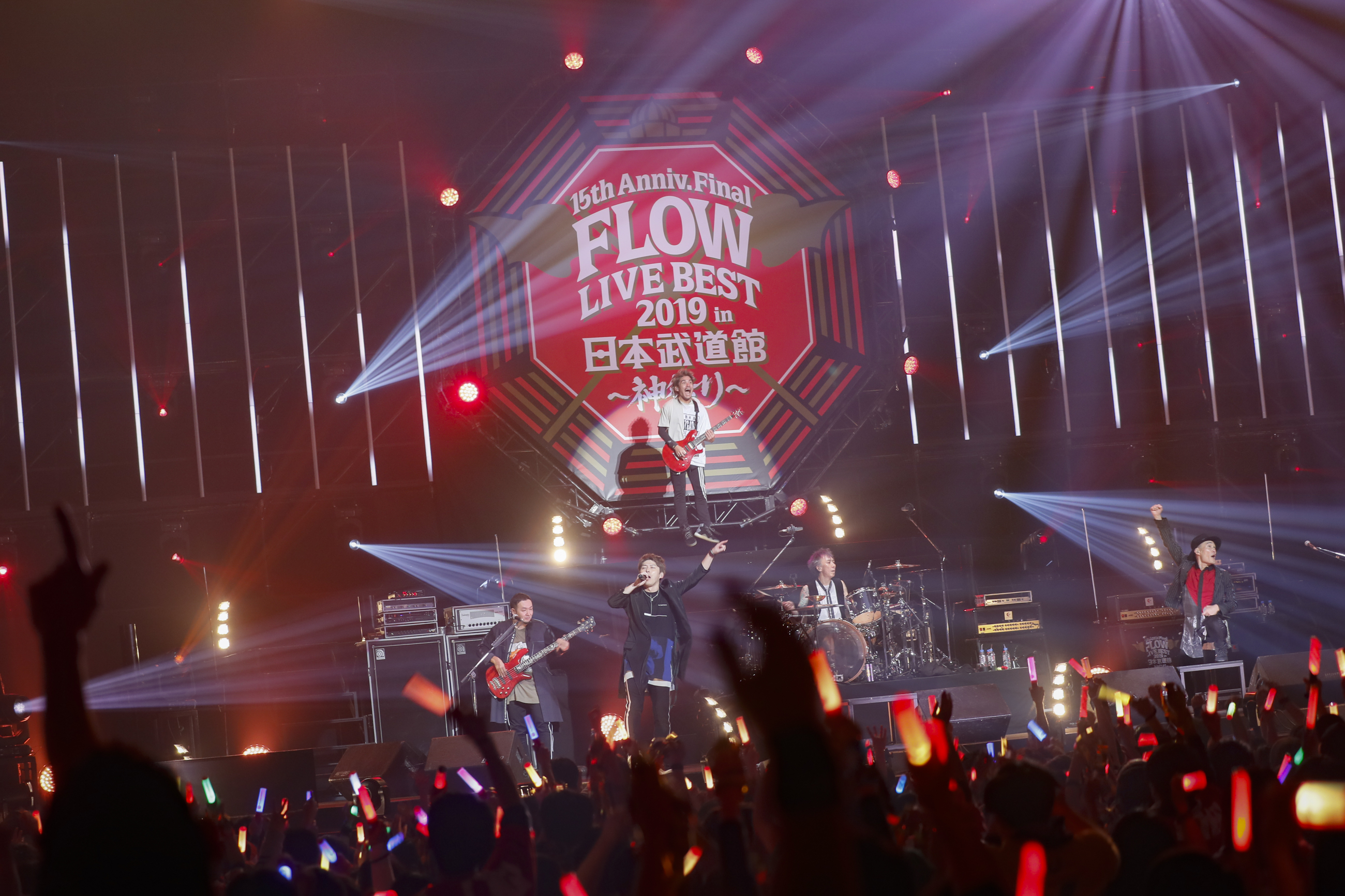 15th Anniversary Final「FLOW LIVE BEST 2019 in 日本武道館 〜神祭り〜」>を行なった。ステージにKOHSHI(Vo)、KEIGO(Vo)、TAKE(Gt)、GOT’S(Ba)、IWASAKI(Dr)が登場した瞬間、全エリアの客席から起こった熱い歓声。“行くぞ、武道館!”とKEIGOが叫んだのを合図に「Break it down」がスタートすると、会場全体が激しく震えた。“今日のライヴは、みんなでしか作れないんだからな!”と最初のインターバルでKEIGOは観客に呼びかけていたが、全力で楽しんでいた人々の熱気が刺激的な空間を作り上げているのをまざまざと感じた。盛り上がり続ける客席の様子を眺めながら、実に活き活きとした表情を浮かべていたメンバーたち。「ブレイブルー」「COLORS」「Answer」など、アニメのファンにもFLOWが深く愛されるきっかけとなった曲はもちろん、懐かしい「メロス」なども大歓声を誘い、日本武道館は圧倒的な一体感で包まれていった。