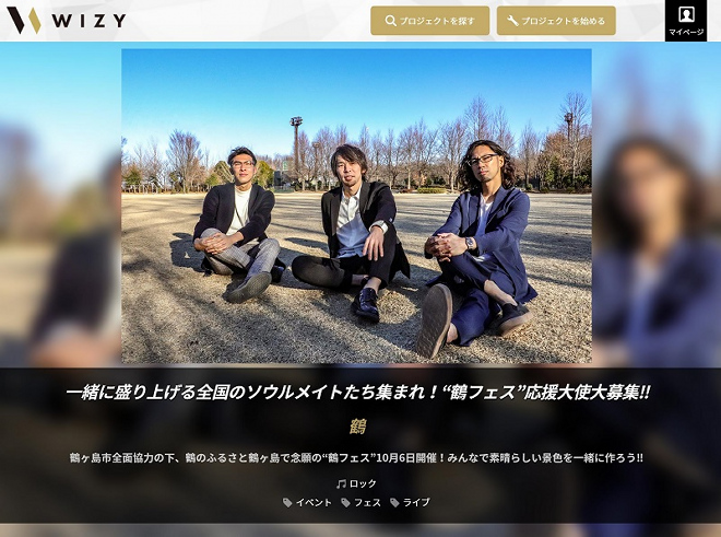 スリーピースロックバンド・鶴が、地元での主催フェス<鶴フェス>を2019年10月6日(日)に埼玉県・鶴ヶ島市運動公園にて、入場無料で開催する。これに伴い、共創・体験型プラットフォーム「WIZY(ウィジー)」での「鶴フェス応援大使」募集が発表された。