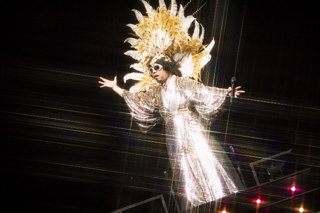 続いては一転、歌謡ショーさながらのド派手な衣装と頭飾りを纏って登場したレキシが、“こぶし”たっぷりの「SAKOKU」から「奈良に大きな仏像」、「KATOKU」を披露。代表曲「きらきら武士」で本編を締めくくった。