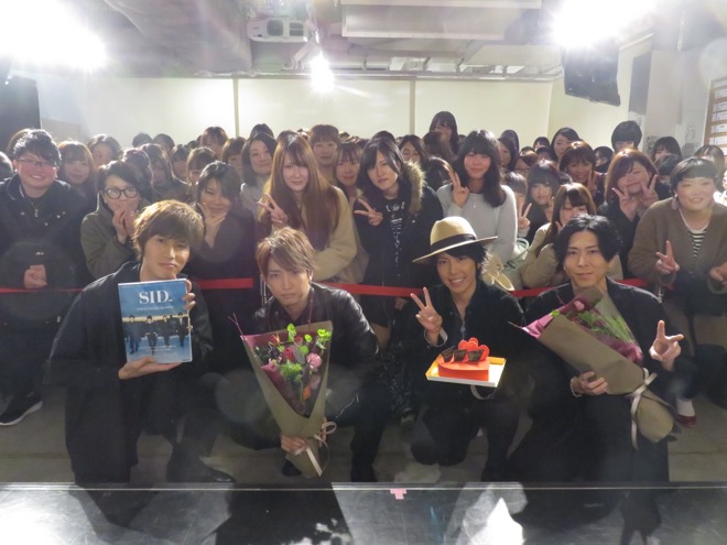 『プレミアムトークショー』の最後には、バンド結成15周年、本書『SIDぴあ』発売、2月3日生まれの明希、2月8日生まれのShinjiの誕生日を記念して、ぴあよりバレンタイン風のケーキと花束を贈呈。参加者をバックに記念撮影を行いイベントが終了した。