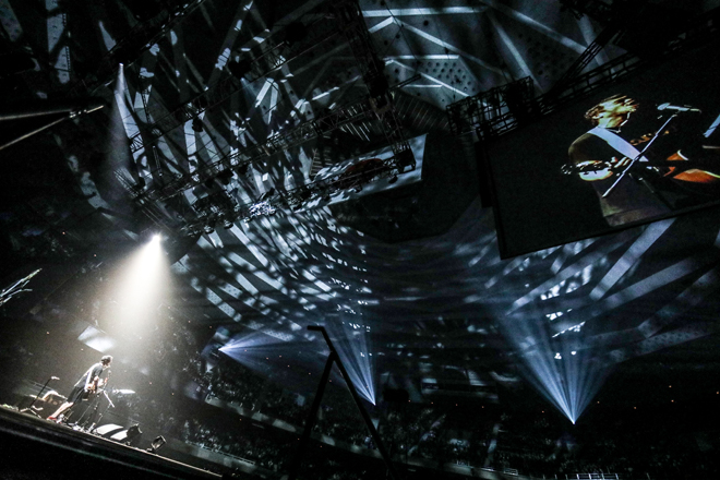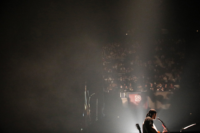 短パンにTシャツ、頭にタオル、足にアディダスのスニーカー。普段のライブと変わらない姿で、ゆっくりとアコースティック・ギターを爪弾く1曲目「オールドルーキー」から、熱い言葉の弾丸が炸裂する。武道館を埋め尽くした観客が固唾を飲み聴き入る中、「LIVE IN和歌山」「どーん!とやってこい、ダイスケ!」など、旅先での出来事や人との出会いから生まれた言葉を、目の前にシーンが浮かぶように生き生きと歌う。照明は白一色のスポットライトのみ、ボクサーのように身をかがめて立ち前方をにらみつけ、ギターとハーモニカだけの伴奏で語るように叫ぶように歌い続ける。凄まじい迫力だが、不思議と怒りや攻撃性は感じない。激情と優しさがないまぜになった、独特の空気が武道館を包み込んでゆく。