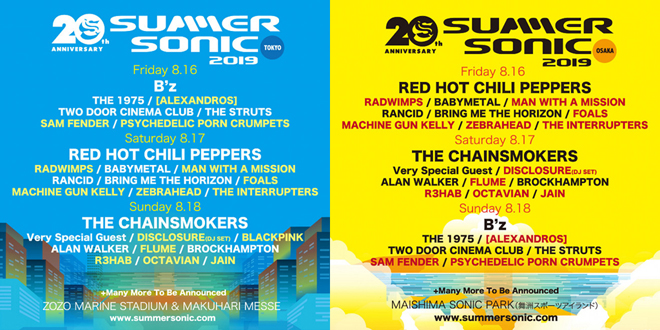20回目の開催を迎える2019年の<サマーソニック>では、レッド・ホット・チリ・ペッパーズ、B’z、ザ・チェインスモーカーズの3組がヘッドライナーを務めることが決定している。