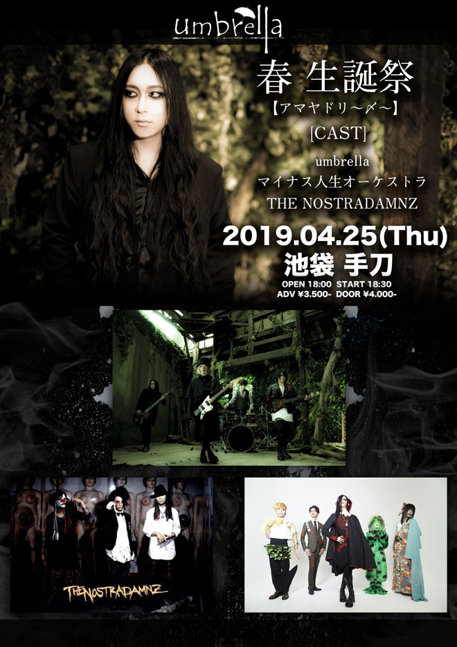 4月25日に池袋手刀にて開催されるこの生誕祭主催は、umbrellaと公私ともに関係の深い「マイナス人生オーケストラ」、「THE NOSTRADAMNZ」とのスリーマンとなる。さらに翌日、4月26日にはNakano Space Qにて春(umbrella)、生虫(マイナス人生オーケストラ)、上邑隼人(THE NOSTRADAMNZ)のトークイベントを開催、三人は二日間連続で共演することになる。生誕祭ライヴのチケットプレオーダーは2月18日(月)の正午から。この公演へ向けメンバーから届いたコメントは以下。