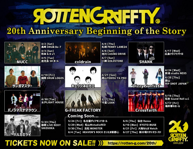 2019年1月1日より活動20周年のアニバーサリーイヤーに突入したROTTENGRAFFTY。3月からスタートするアニバーサリーツアーには、MUCC、coldrain、SHANK、サンボマスター、キュウソネコカミ、Dizzy Sunfist、パノラマパナマタウン、G-FREAK FACTORY、Crossfaith、ハルカミライの10組の出演が決定した。