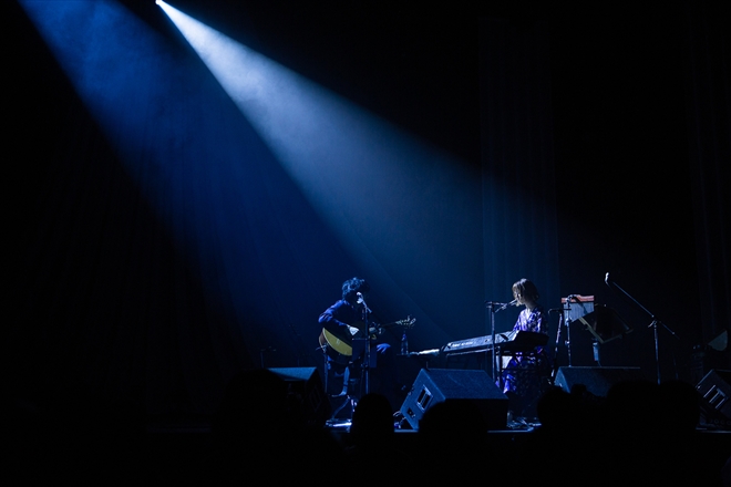 タイトル通り、メンバーふたりだけでステージに立つこのスタイルは実に4年ぶり。前回はマシンを操る場面も多かったが、今回の演奏はすべて人力の完全アコースティック。柾がアコギのボディを叩いてテンポを出し、YUKAがウィンドチャイムを鳴らして歌い始めると、サーッと空気が浄化されたようにmoumoonのファンタジックな世界が広がっていった。