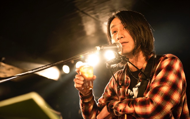 続いてはMO’SOME TONEBENDERのフロントマン百々和宏がエレキギターによる弾き語りで登場だ。角打ち酒屋に生まれ、酒場を呑み歩くコラム連載を持つなど酒好きとしても知られる百々は、ステージに上がると、まずは自身にちなんだドリンク“もものウーロン茶割り”をオーダー。出演者をモチーフにしたスペシャルドリンクが提供されるのも<貴ちゃんナイト>の名物でもある。