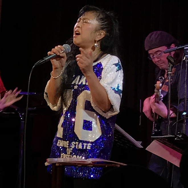 ペニー:そう。よく知ってるね。そのときのバンマスが星川さん。オリジナルはやらないで全部カヴァー。ポインター・シスターズが多かったですね。それをやってくうちに、シンシアの紹介で専門学校で講師をやらないかっていわれて、9年ぐらいシンシアと2人でやってたの。