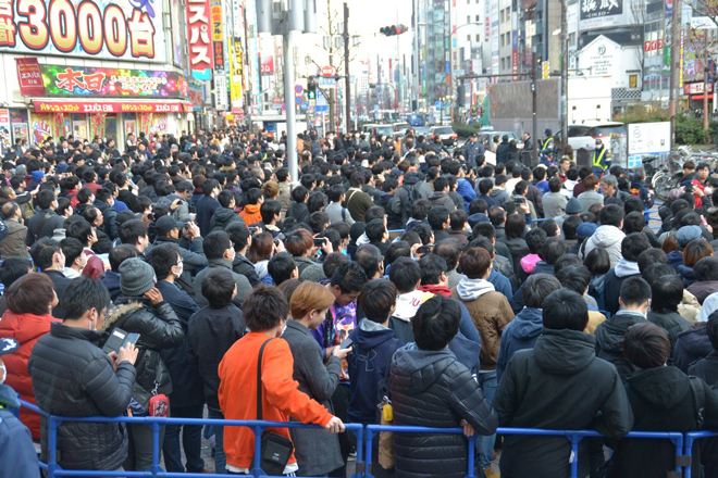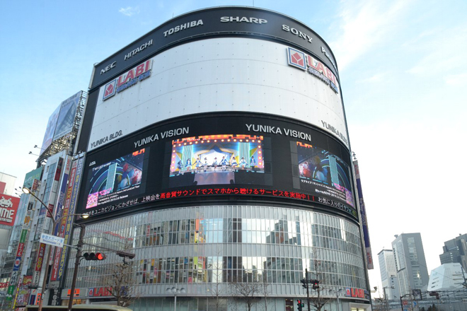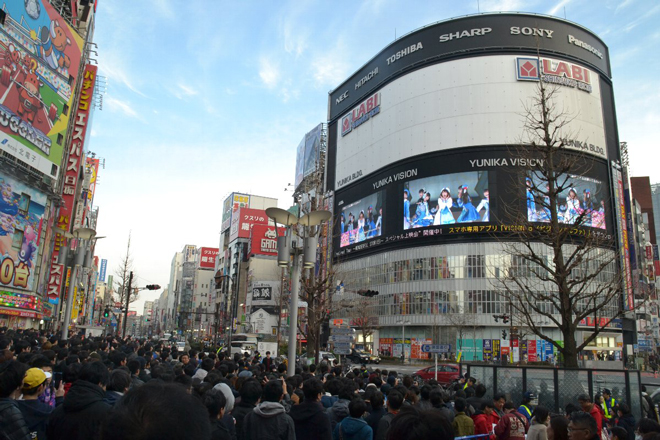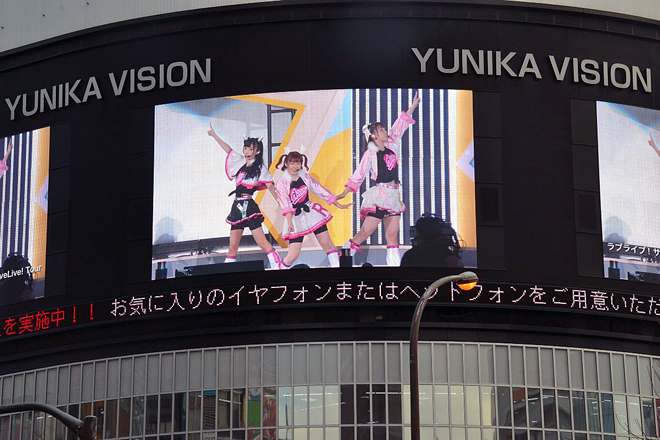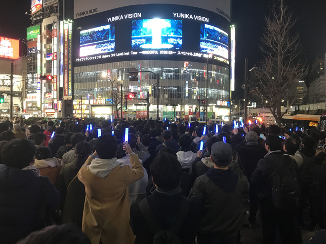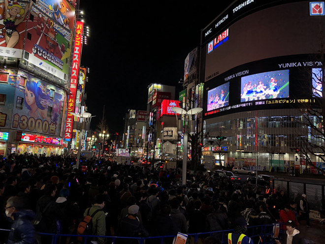 18時からの回には、さらに観客が増え、鑑賞エリアの柵を後方移動して収容人数を拡大。昨年の上映会同様、1,000人前後の観客が集まっているようだ。夜になりかなり冷え込みも厳しいが、熱心なファンは16:00の回に続いて、すぐに会場の列に並び、より映像を近くで見ることができる場所を確保して、スタンバイしていた。上映会スタート時にユニカビジョンにぺぺ広場の様子が映し出されると、一斉にペンライトを振る観客たち。ペンライトの灯りも目立つようになり、オープニングの「未来の僕らは知ってるよ」から、ぺぺ広場は先ほど以上の盛り上がりだ。駅を行き来する人々も、「これ、なんの集まりですか?」と聞いてくるほどだった。また、新宿には外国人観光客も多い。激しく疾走するサウンドによるパフォーマンスの「Awaken the power」では、立ち止まってユニカビジョンとペンライトを振って声援を送る観客を、興味深そうに交互に眺めながら、スマホで動画撮影している人も見受けられた。