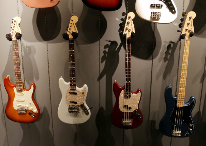 ▲左からTelecaster、Mustang、Mustang Bass、Precision Bass。それぞれ多彩なカラーを揃える。
