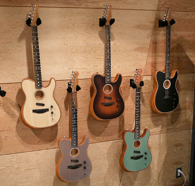 ▲5色をラインナップするAmerican Acoustasonic Telecaster。上段左からNatural、Sunburst、Black、Surf Gray、Surf Green。製造は米コロナ工場で行われている。