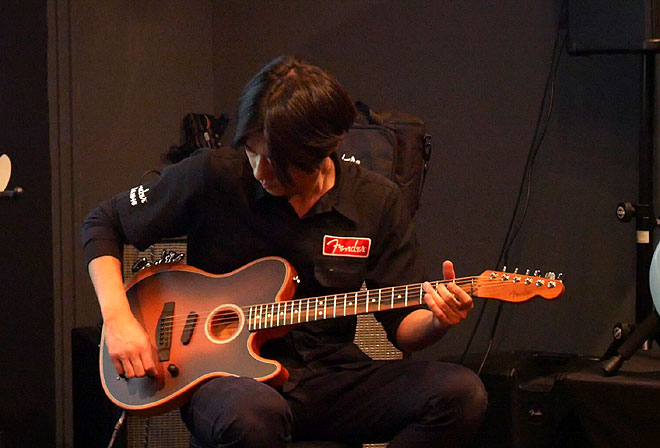 もう1つのキープロダクトとなるのが、“Completeley new instrument(まったく新しい楽器)”のコンセプトで登場した「American Acoustasonic Telecaster」。今回のNAMMでは同製品のプレゼンテーションを行うシークレットイベントを開催、3組のアーティストがライブを行った。日本からはアジアを代表してMIYAVIがパフォーマンスを披露、参加アーティストの中で最も高い評価を得たという(この模様はYouTubeで見ることができる)。MIYAVIは「こういう製品を待っていた」と語ったとのこと。