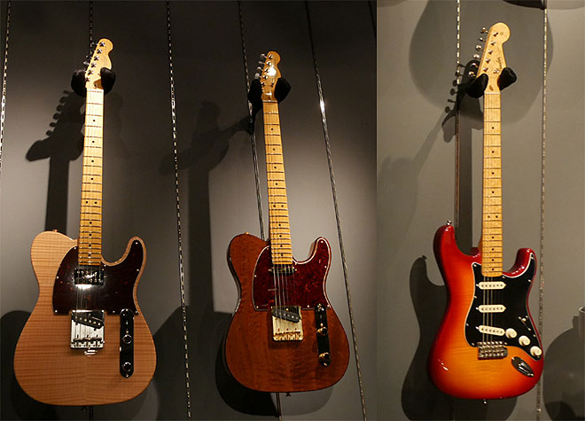 ▲今回の展示会では、木目が美しいRaritiesコレクション3モデルが展示。左から「Rarities Frame Chambered Telecaster」(7月発売)、レッドマホガニートップを採用した「Rarities Red Mahogany Top Telecaster」(5月発売)、2ピースアルダーボディにフレームアッシュトップの「Rarities Frame Ash Top Stratocaster」(6月発売)。価格は330,000円(税別)。