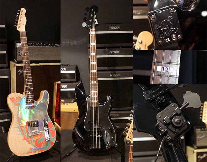 ▲「Jimmy Page Telecaster」(左、190,000円)と「Duff McKagan Deleuxe Precision Bass」(中)とはメキシコ製。「Duff McKagan Deleuxe Precision Bass」のネックプレートにはダフスカルアンドクロスボーンのロゴ、ローズウッド指板の12フレット部には“12”というパーロイドブロックのインレイを施した。瞬時にドロップDに変えられるHipshot Bass Xtenderも搭載(右下)。カラーはブラックとホワイトパール。