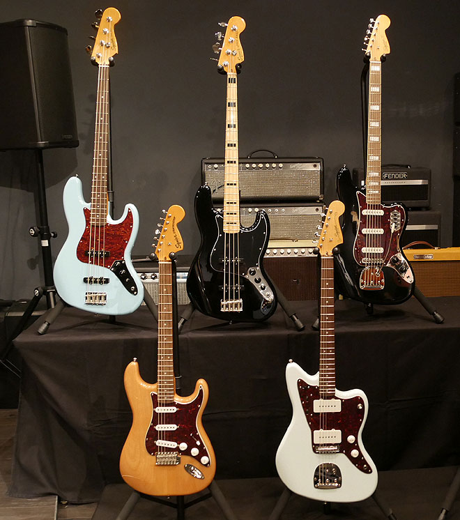 ▲Squier Classic Vibeからは、60s Jazz Bass、70s Jazz Bass、Bass VI(上段)、70s Stratocaster、60s Jazzmaster(下段)が展示。