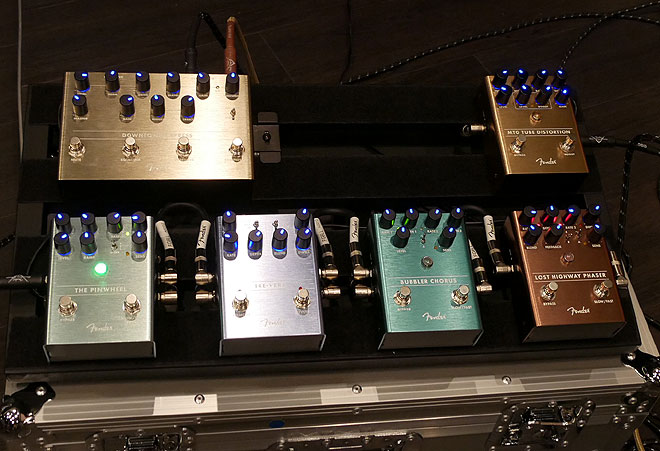 ▲左上からベース用の「Downtown Express」、右が「MTG Tube Distortion」(ディストーション)。下段は「The Pinwheel」(ロータリースピーカーエミュレーター)、「Tre-Verb」(リバーブ)、「Bubbler Chorus」(コーラス)、「Lost Highway Phaser」(フェイザー)。LEDによりつまみの位置が暗いステージでも見やすいのがフェンダーペダルの特徴。