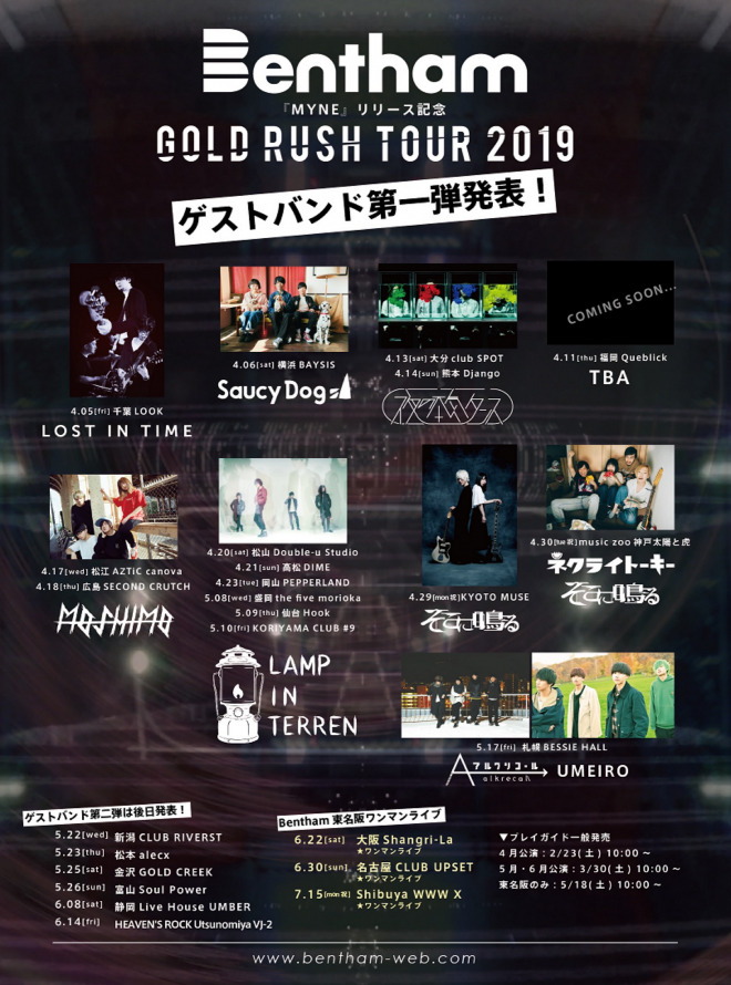 さらに、史上最大規模となる全国ツアー・Bentham『MYNE』リリース記念「GOLD RUSH TOUR 2019」の対バンも発表された。この第一弾で発表されたのはLost in time、Saucy Dog、夜の本気ダンス、MOSHIMO、LAMP IN TERREN、そこに鳴る、ネクライトーキー、アルコリコール、UMEILO。