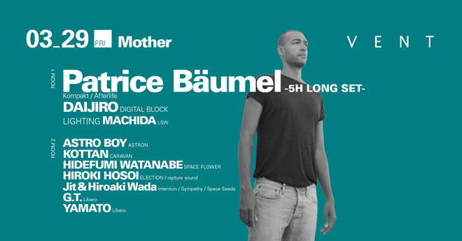 そんな自分の音楽を“大人のためのテクノ”と呼ぶパトリース。美しく深い愛情に溢れたディープな世界観が詰まったパトリース・ボーメルのプレイを、表参道VENTが誇るサウンドシステムでぜひ体感してほしい。