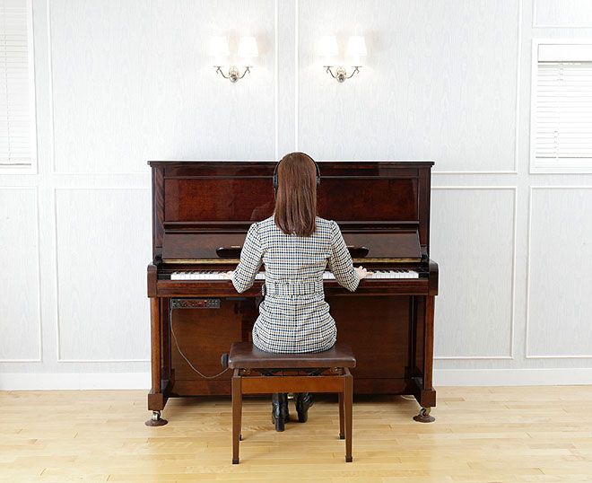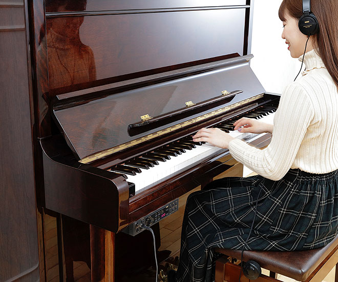 アクションに消音バーを取り付け、ハンマーが弦を打つ直前で止めることで、アコースティック・ピアノの音が消えるのが消音の仕組み。アップライト・ピアノにこの消音機構と音色/機能を追加する音源ボックスを取り付けることで、家族がテレビを見ている時間や夜間でもヘッドホンでピアノ演奏が楽しめる。消音機能のオン/オフ切り替えは鍵盤下部に取り付けるレバーでカンタン操作。あとはボリューム・ノブで好みの音量に調節するだけのシンプルなシステムだ。ダンパー・ペダル、ソフト・ペダルを使用した演奏も忠実に表現。ハーフ・ペダルを使用した演奏も可能だ。