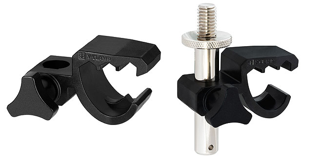「V CLAMP」は適度な硬さの素材を採用することで、一般的なスネアやタムドラムのリムに容易にマウントできる汎用のマイククランプ。マイクの高さや角度はネジノブを緩めることで瞬時に調整可能。シャフトに付いている小さな穴は、ケーブルをまとめるタイクリップを取り付けたり、あるいはノブを失くさないようにヒモで取り付けるといった利用法が可能だ。