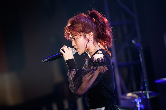 続く「願い~あの頃のキミへ」では、本人は意識していないものの、細かい手の振り方など歌の感情表現がそのまま身体の動きに表出していて、歌への強い入り込み方に感動を覚えた。なのにMCになると、今日のイベントに出演した3人のつながりや楽屋でのスイーツ話など、楽しいお喋りが止まらない。一方、ピアノのサウンドに合わせて歌い始めるバラード「君のとなり」では、途中から頭上からもライトが当たってドラマチックな見せ場となり、しかも、最後の一言まで丁寧に繊細に歌う姿勢には胸に迫るものがあった。そして、そのまま「光」へと続いた。