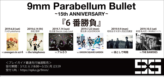 また、15周年を記念して同世代同期のバンドとガチ対決をする“VS企画”として開催される公演、<〜15th Anniversary〜『6番勝負』>の第二弾共演者発表も行われた。“9mmの日”でもある9月9日(月)@昭和女子大学人見記念講堂に凛として時雨、男性限定ライブとなる最終日の10月5日(土)@新宿BLAZEにTHE BAWDIESが出演することが発表され、これで6組すべてが出揃った。本公演のチケットは、現在イープラスにて最速先行受付中である。