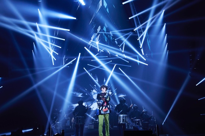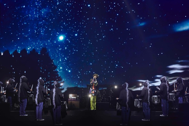 そして本編ラストのパートは、彼の歌を真っ直ぐに聴かせる3曲。疾走感に満ちた「Nighthawks」から、「orion」では再び10名の太鼓隊が米津を囲むように登場し、LEDビジョンに映し出された星空を背後に歌を響かせる。