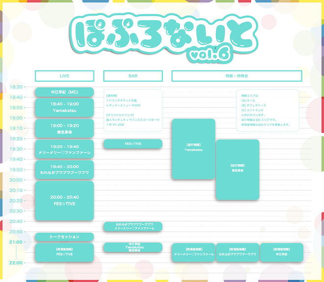 ※終演後、会場内・会場併設バースペースで物販及び特典会があります。