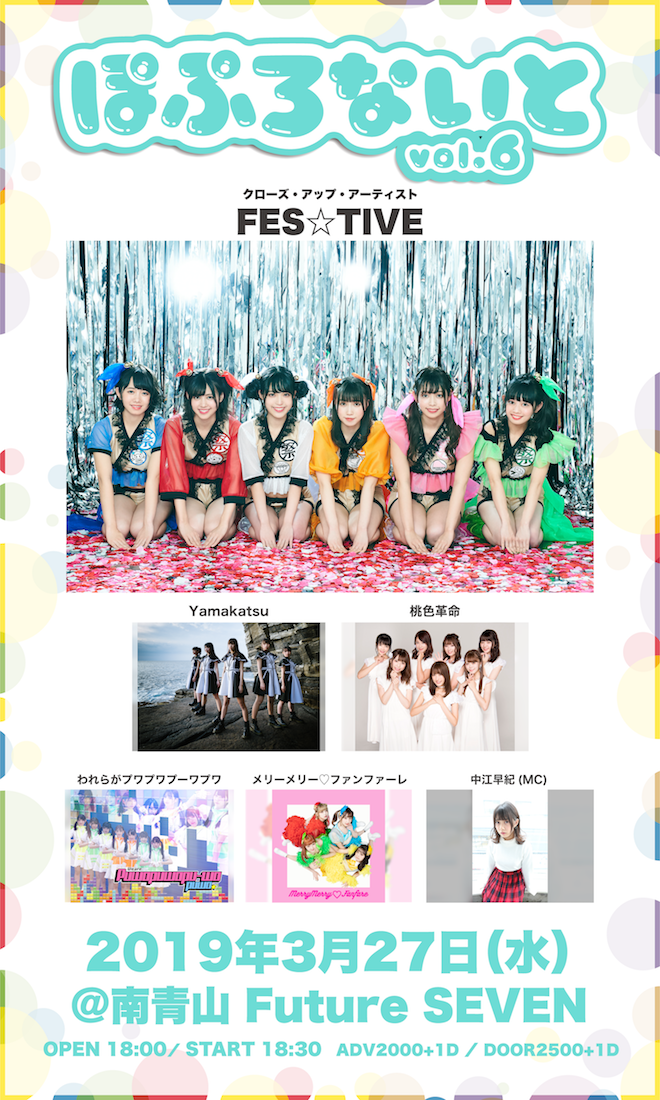 BARKSが運営するアイドルサイト『Pop’n’Roll』の名前を冠したアイドルライブイベント<ぽぷろないと vol.6>が、3月27日(水)に南青山Future SEVENで開催される。出演は、FES☆TIVE、われらがプワプワプーワプワ、メリーメリー♡ファンファーレ、桃色革命、Yamakatsu、中江早紀(MC)。