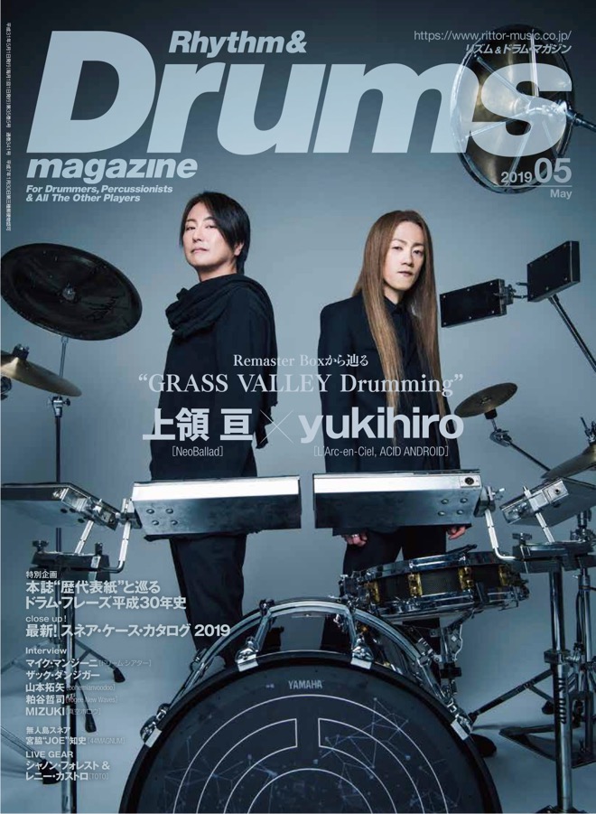 上領 亘(NeoBallad)とyukihiro (L’Arc-en-Ciel / ACID ANDROID)が、3月25日発売のリズム&ドラム・マガジン(2019年5月号)の表紙に登場する。