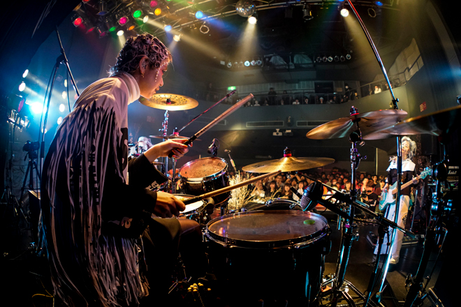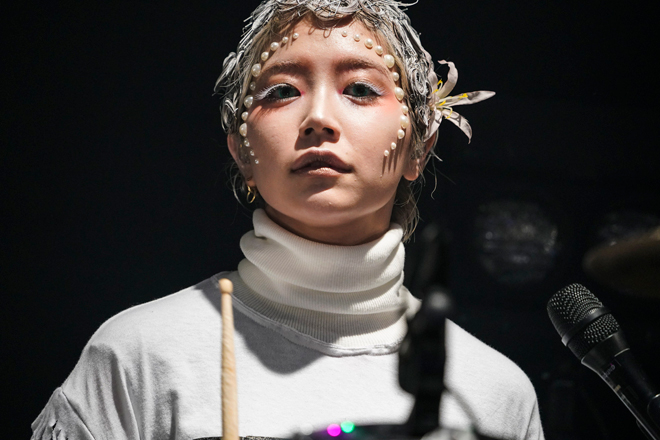 定刻20時が過ぎてしばらくすると、「恋のエスパー」をモチーフにしたシンフォニックなSEとともにステージ上にはスモークが立ち込め、メンバーが定位置につく。そして、すぅ(Vo&G)がギター1本で切なげに歌い始めた。曲は、『31313』収録のエモーショナルなロックチューン「クリームソーダ」。