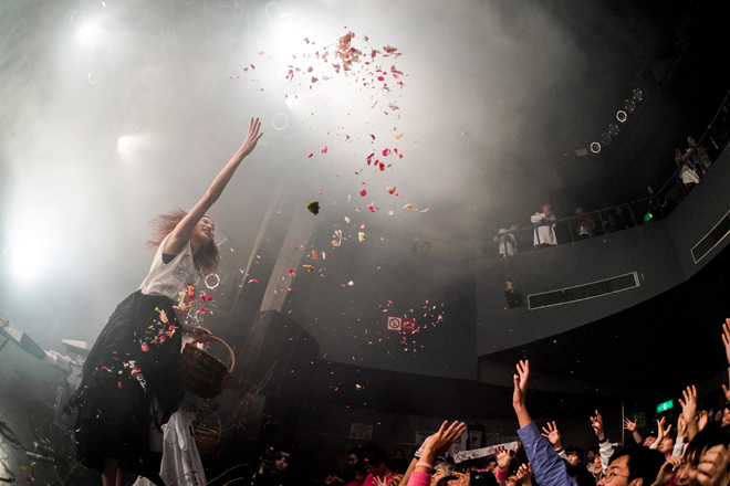 ここまでほぼノンストップで曲をつなげてきたが、中盤にきてようやくすぅがゆっくりと話を始めた。「アルバム、聴いてくれましたか? かなり長い時間をかけてゆっくりゆっくり愛情を込めて作り上げました」と『31313』の制作について振り返ったあと、「いろんなバンドやアイドルが活動を止めている中、こうやってひとりでもお客さんがいるってことは幸せなことなんじゃないか」と10周年イヤーに突入する自らのバンドを誇ってみせた。