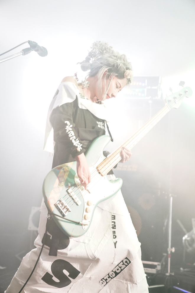 「クリームソーダ」が終わると、間髪入れずに同じく新作から「Attack」を叩き込む。あいにゃん(B)のよく動くベースラインが演奏を引っ張り、ひなんちゅ(Dr)のドラムがグッと前に出てくる。「女子校戦争」が始まるとフロアの盛り上がりはより一層高まった。いつもと雰囲気の違うライブ、そして東京では久しぶりとなる小箱でのライブとあってメンバーもどことなく緊張しているように見えるが、ライブでの鉄板曲を鳴らすことでいつもの調子を徐々に取り戻していった。